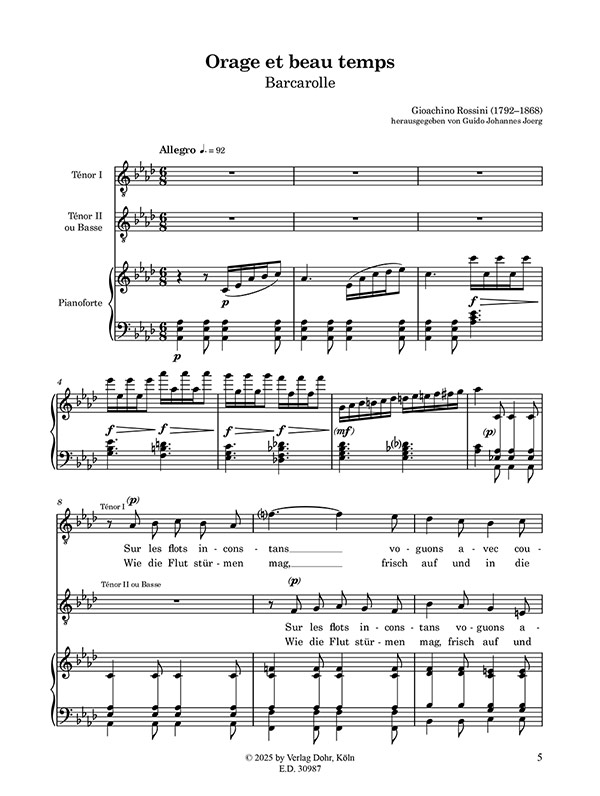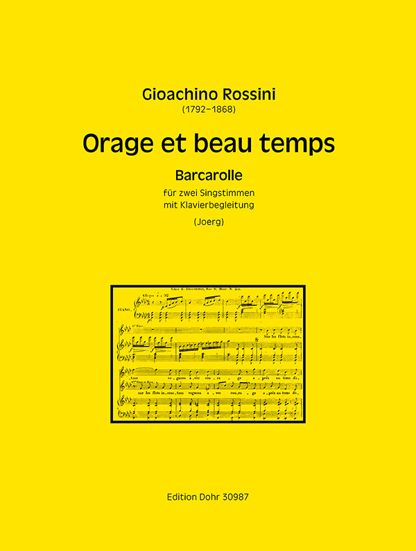 Zum WerkDie Barcarole ist ein schönes, dabei aber recht einfach konstruiertes Duett, das eine Vielzahl an Besetzungen ermöglicht. Der Klaviersatz ist nicht anspruchsvoll; nur von der oberen der beiden Vokalstimmen wird eine durchaus souveräne Höhe verlangt. Die schöne Kammerkomposition ist sehr typisch für Rossinis Musikstil. Äußerst lebendig hat er die Verse Ambroise Bétournés in Musik gesetzt. (Guido Johannes Joerg). Zur AusgabeUnterlegt ist der originale französische Text von Bétourné sowie eine singbare deutschsprachige Nachdichtung von Siegfried Carl. Neben Nachwort und Kritischem Bericht des Herausgebers Guido Johannes Joerg kommt auch ein kurzer Beitrag von Rüdiger Krüger ("Post Skriptum") zum Abdruck. |