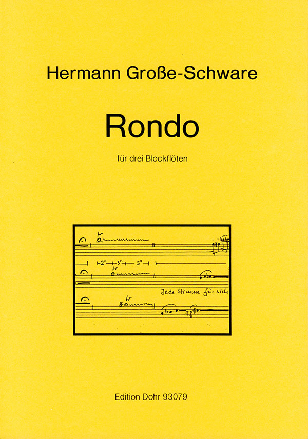 Zum WerkEin eigentliches Rondothema wird man in dem Werk vergeblich suchen. Der Titel bezieht sich auf bestimmte Aktionen, die mehrfach in veränderter Form wieder aufgegriffen werden. Dabei wechseln sich taktgebundene Abschnitte in traditioneller Notation mit taktfreien Abschnitte ab, die in einer leicht lesbaren aleatorischen Schrift notiert sind. Der besondere Reiz dieser Abschnitte liegt in der Notwendigkeit, die eigene rhythmisch freie Gestaltung mit dem Spiel der Partner zu koordinieren. Die Spielpartitur ermöglicht die Orientierung an den Nachbarstimmen. Trotz der zum Teil ungewöhnlichen Anforderungen ist das Stück nicht schwierig. Die erste Flöte wechselt allerdings zwischen Alt und Sopranino, für die zweite Stimme wird neben der Altflöte auch die Sopranflöte vorgeschrieben. Die dritte Stimme wurde bei der ersten Aufführung im Rahmen von "Jugend musiziert" von einem Fagott übernommen, die dann notwendigen Änderungen (vor allem Oktavierungen) dürften sich sozusagen von selbst ergeben. (Hermann Große-Schware) Dauer: ca. 3'30'' Besetzung