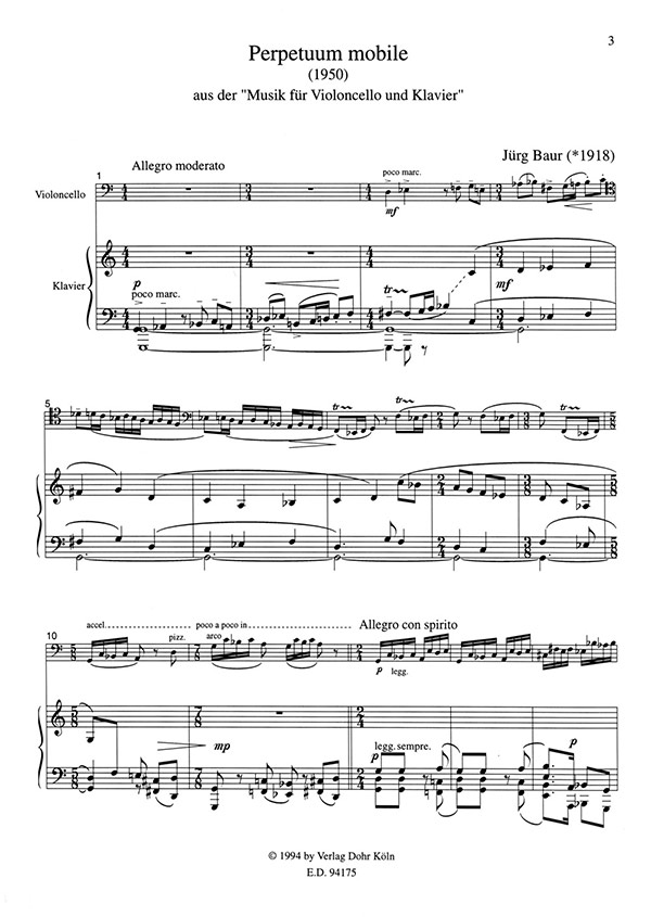Zur KompositionDieses Stück, ursprünglich Finale einer mehrteiligen "Musik für Violoncello und Klavier", ist eine (streng) symmetrisch gegliederte Fantasie, mit den ineinander übergehenden Formteilen A-B-A'-B'-A''. A: Ein zwölftöniges chromatisch ansteigendes Fugenthema wird gleich zu Beginn exponiert, bildet einen Höhe- und Schwerpunkt im Zentrum des Satzes und klingt am Schluss nochmals kurz an. B: Das eigentliche "Perpetuum mobile"; ein motivisch spielerisch-virtuoses Figurenwerk in wechselndem Metrum wird weit ausgebreitet, häufig variiert, vorwiegend vom Cello vorgetragen; der Satz bleibt in ständig fließender Bewegung, läuft in freier Tonalität und harmonischen Schwerpunkte ab. (Jürg Baur) |