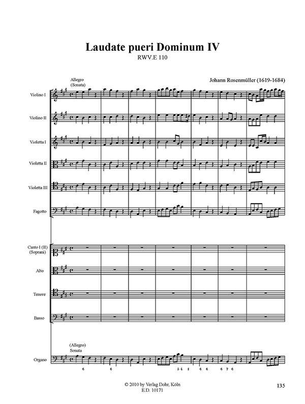Laudate pueri Dominum IV für vierstimmigen gemischten Chor (Canto I auch geteilt), Streicher (Violino I, Violino II, Violetta I, Violetta II, Violetta III) und Basso continuo (Fagotto, Organo) |