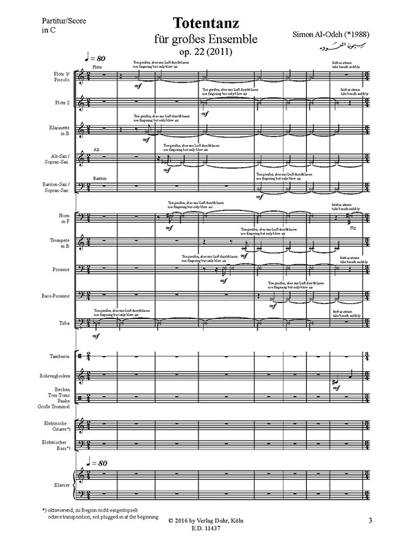 - Schlagwerk: Tamburin, Röhrenglocken, Becken, Tom Toms, Pauke, Große Trommel