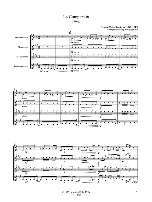 La Cumparsita. Tango argentino für Saxophonquartett (SATBar) eingerichtet von Wolfgang Birtel Partitur und Stimmen M-2020-2843-8 |