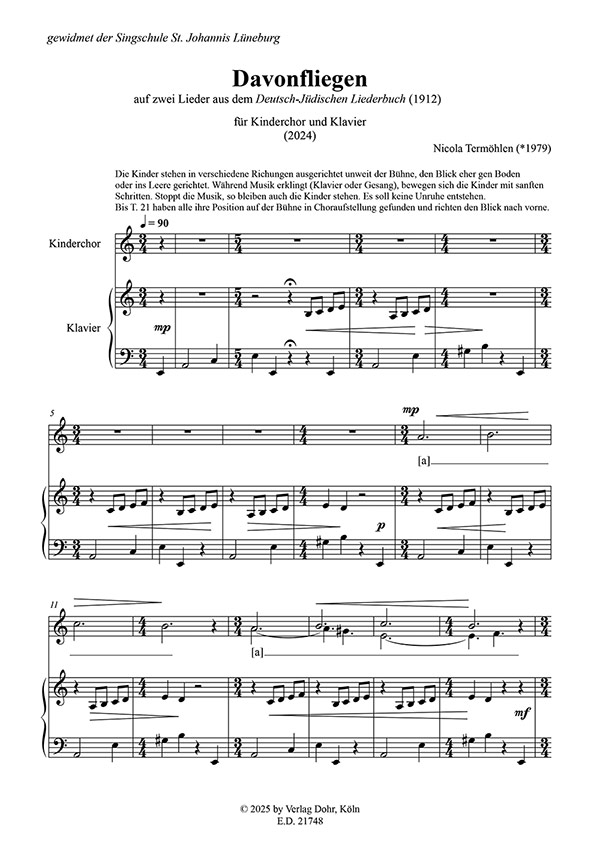 Davonfliegen (2024) für Kinderchor und Klavier Partitur, zgl. Chorpartitur M-2020-4748-4 |