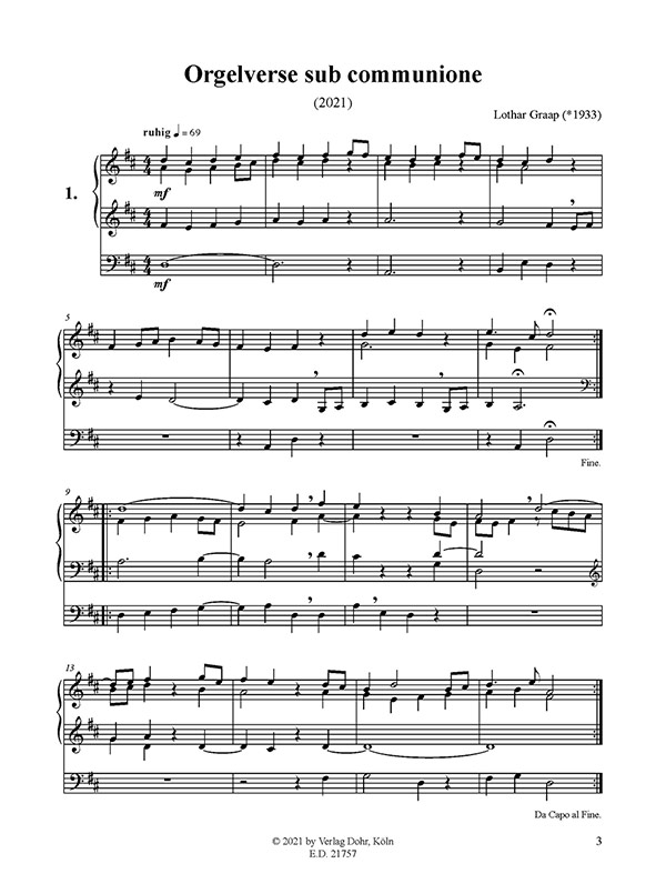Zum WerkEs ist üblich, dass während der Kommunion oder der Austeilung des Abendmahls dezente Orgelmusik erklingt. Orgelkompositionen sind aber oft zu lang und können nicht vorzeitig beendet werden. Die hier angebotenen freien "Orgelverse" schaffen Abhilfe: Sie sind von überschaubarer Länge, und bei Bedarf kann problemlos ein zweites Stück anschließen. Sie sind technisch nicht allzu schwer, und die Pedalstimme ist leicht ausführbar. Somit können die "Orgelverse" auch von Schülern oder nebenamtlichen Organisten musiziert werden. (Lothar Graap) |
