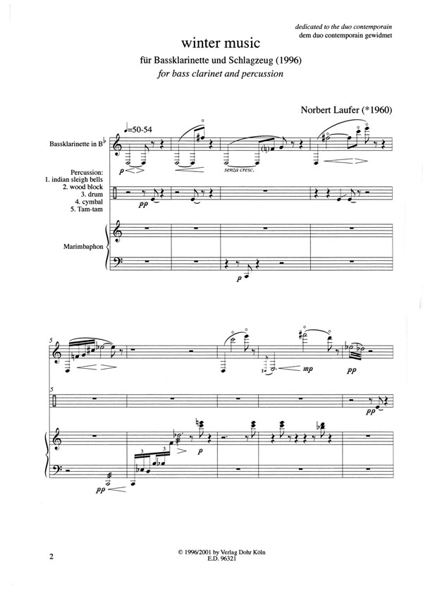 Zum WerkDauer: 10' "winter music" schrieb ich für das duo contemporain mit Henri Bok, Baßklarinette, und Miguel Bernat, Schlagzeug, das diese Komposition am 9. Juni 1996 im Forum Wasserturm in Meerbusch-Lank (bei Düsseldorf) innerhalb des Festivals Facetten '96 uraufführte. Es werden viele neue Spieltechniken für die Baßklarinette eingesetzt. Für Multiphonics sind Griffvorschläge von Henri Bok angegeben. |