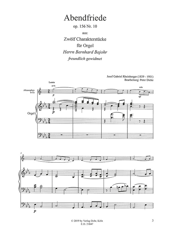 Abendfriede op. 156 Nr. 10 für Altsaxophon in Es und Orgel bearbeitet von Peter Dicke Partitur und Stimme M-2020-0847-2 |
