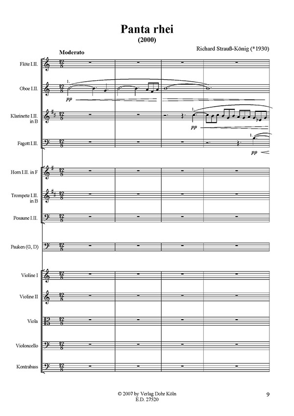 Panta rhei (2000) "Panta rhei"(griechisch: "alles fließt"): Der aus der griechischen Philosophie stammende Grundsatz will sagen, dass das Sein ein dauerndes Werden, eine ewige Bewegung ist. Gleich dem Wasser eines Stromes fließt auch unser Leben dahin, bis es ins Meer der Ewigkeit mündet. Davon inspiriert, versucht die sinfonische Dichtung in - gleichsam das Fließen des Wassers symbolisierend - vorwiegend wellenartigen Tonfolgen im Verbund mit expressiven Epiphänomenen sich diesem Gedanken zu nähern. |