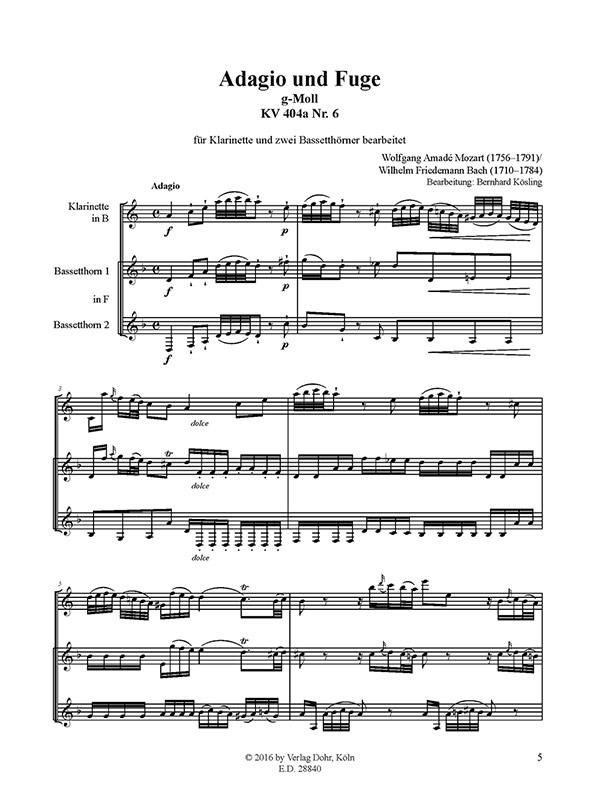In der hier in einer Bearbeitung für Klarinetten/Bassetthörner vorgelegten Nr. 6 hat Mozart die Fuga Nr. 8 von Wilhelm Friedemann Bach bearbeitet.