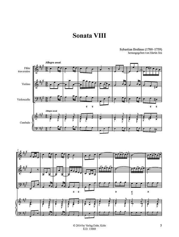 Sonata VIII A-Dur für Flöte, Violine und Basso continuo hrsg. von Martin Jira Partitur und Stimmen M-2020-2888-9 |