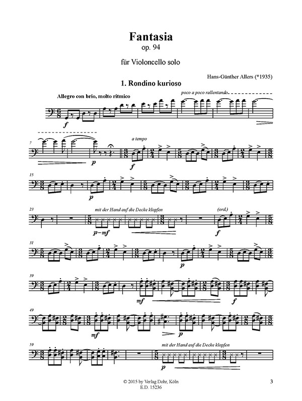 Während der Vorproben zu einem Kammerkonzert baten mich dessen Interpreten, ein Ehepaar (er Hornist, sie Cellistin), als Repertoire-Ergänzung um ein kleines Duo für Horn und Violoncello sowie um ein Stück für Violoncello solo. Diese Anregung griff ich gerne auf, und so entstanden in kurzer Zeit zwei Werke, nämlich das Duo concertante op. 93 für Horn und Violoncello (als E.D. 15235 ebenfalls in der Edition Dohr erschienen) und die Fantasia op. 94 für Violoncello solo. Beide Kompositionen wurden später von einem anderen Duo, nämlich Wilfried Krüger (Horn) und Irene von Fritsch (Violoncello), am 26. Februar 2005 im Rahmen der Schwarzenberger Schlosskonzerte uraufgeführt. |