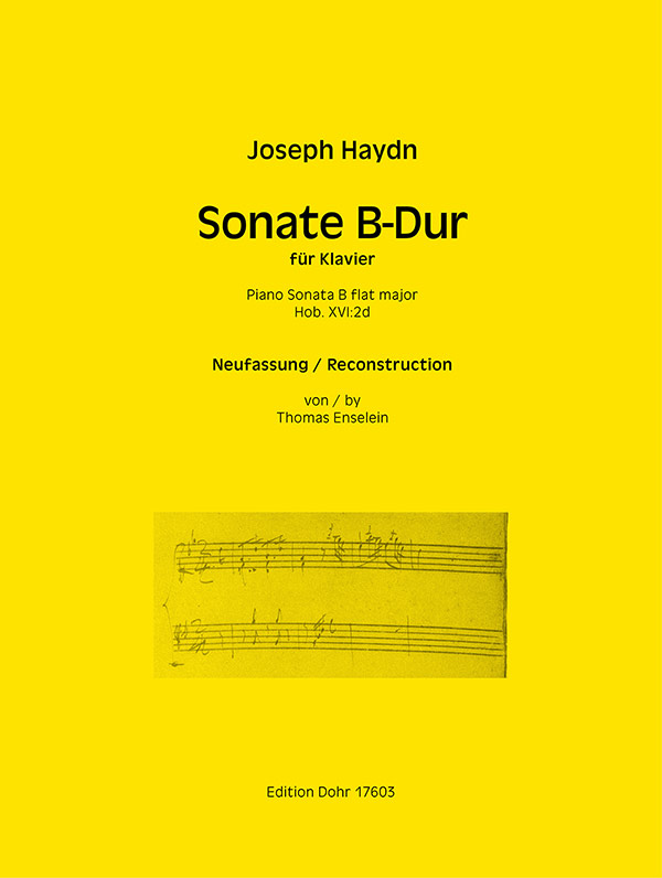 Von der Existenz der sieben verschollenen Klaviersonaten Hob. XVI: 2a-e und g-h wissen wir lediglich durch Haydns Eintragungen ihrer Incipits im sogenannten "Entwurf-Katalog". Entstanden sind die fraglichen sieben Sonaten nach derzeitigem Forschungsstand vermutlich in der Zeit zwischen 1766 und 1772. Die vom Haydn-Spezialisten Thomas Enselein erstellten Rekonstruktionen dieser sieben Sonaten sind sowohl in Einzelausgaben wie auch in einem Sammelband (E.D. 17600) erhältlich. Zur jeder Neufassung hat Enselein einen "Werkstattbericht" (deutsch/englisch) erstellt, in dem er sein Vorgehen bei der Rekonstruktion der einzelnen Sonate erläutert. "Nach einer anfänglichen Skepsis gegenüber Vervollständigungen haben mich aber die Arbeiten von Thomas Eseleien sehr positiv überrascht. Beim ersten Durchspielen überzeugte nicht nur das klangliche Ergebnis, sondern bei näherer Beschäftigung beeindruckten uns auch die Stilsicherheit und die kompositorische Raffinesse von Herrn Enselein." (Prof. Gerald Hambitzer, Hochschule für Musik und Tanz Köln, in einer E-Mail an Verleger Christoph Dohr am 16. März 2017) |