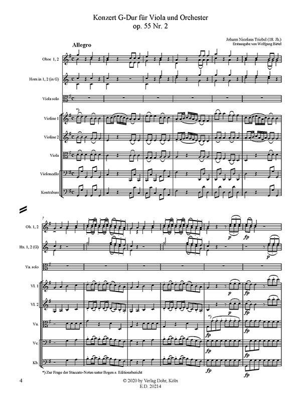 Zum WerkJohann Nicolaus Triebels Violakonzerte sind klassische Konzerte mit Standard-Besetzung (2 Oboen, 2 Hörner und Streicher) in klassischer dreisätziger Form (Sonatensatz, jeweils sehr umfangreich - gesanglicher Satz - Rondo). Der Klavierauszug, dem auch die Solo-Stimme beiliegt, wurde vom Herausgeber erstellt. Das Orchester-Stimmenset hat den Umfang 4/3/2/2/1-Harm.). Satzfolge