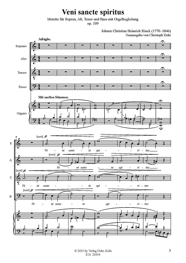 Zum WerkRincks Motette op. 109 existiert in einer originalen, deutsch textierten Fassung als "Gott, sey uns gnädig" (E.D. 24177) und mit einer lateinischen Textierung als "Veni sancte spiritus" (die vorliegende Ausgabe). Die Substanz ist in beiden Fassungen gleich, in der Rhythmisierung und im melodischen Verlauf gibt es jedoch zahlreiche Änderungen. |