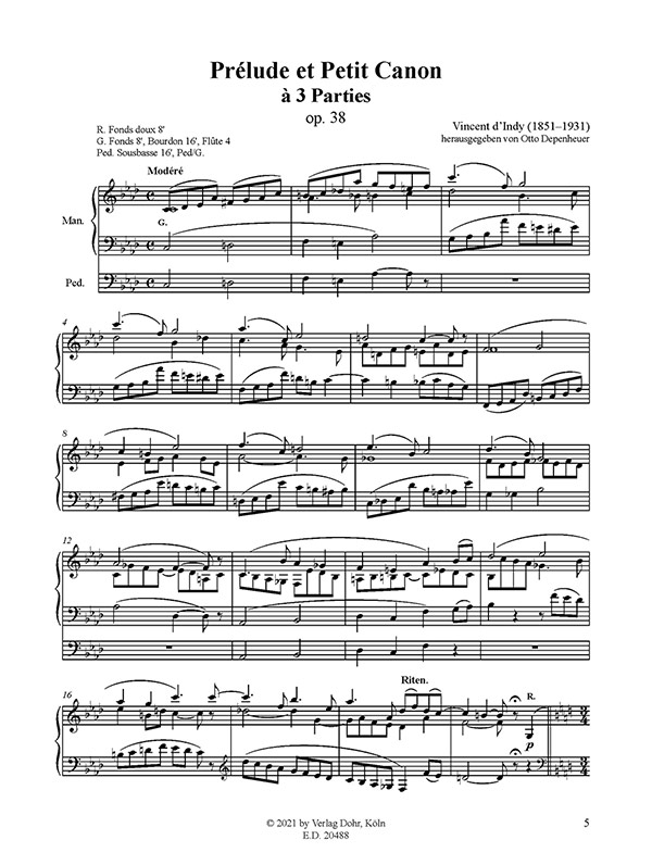 Zu dieser AusgabeAuf die Entwicklung der französischen Musik gegen Ende des 19. Jahrhundert übte Vincent d’Indy ähnlich großen Einfluss aus wie sein Zeitgenosse Charles-Marie Widor: kompositorisch in fast allen musikalischen Genres präsent, hat er ein ebenso umfassendes wie bedeutendes symphonisches Œuvre hinterlassen, in dem freilich das Orgelwerk des zeitweiligen Organisten (in Saint-Leu-la-Forêt) und Mitbegründers der Schola Cantorum bemerkenswert überschaubar bleibt.Alle genuin für die Orgel komponierten Werke eignet ihnen ein ausgesprochen kontemplativer, religiös inspirierter und nobler Gestus, dem jeder exaltierte Selbstdarstellungsgestus fremd ist. Strenge und filigrane Satztechnik stehen ganz im Dienst der musikalischen Aussage. "Prélude et petit Canon" op. 38 entstand 1893. Das Thema prägt zusammen mit seinem Kontrapunkt sowohl das Prélude wie den Kanon, erscheint in der Reprise in der Umkehrung, bevor die aparte Komposition mit dem Kanon endet. Die "Vêpres du Commun des Saints" op. 51 komponierte d’Indy 1899; sie erschienen erstmals 1907 im Eigenverlag der Schola Cantorum. Die Bearbeitung der gregorianischen Vorlagen erfreute sich seinerzeit großer Beliebtheit. Die "Petite Chanson grégorienne" op. 60 zeugt einmal mehr von der lebenslangen Verbundenheit d’Indys zur gregorianischen Musik. Diese aparte Miniatur erschien in der Originalbesetzung für Klavier zu vier Händen im "Album pour Enfants petits et grands. Receuil de Pièces de piano, à 2 et 4 ms, composée par un group des musiciens de la Schola Cantorum" (1904/1905). Das "Prélude" op. 66 erschien erstmals 1911 in einer Fassung für "Orgel oder Harmonium" im ersten Band der von Joseph Joubert (1878–1963) herausgegebenen "Les Maîtres contemporains de l’Orgue" Die Orgelfassung erschien 1913 bei Durand (Paris). (Otto Depenheuer) |